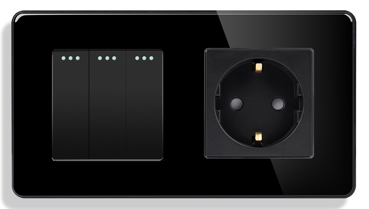 Модель G157D-PSW3G-ST.BL від 1DAL — це комбінований пристрій, що об'єднує механічний 3-клавішний вимикач і стандартну розетку із заземленням (Schuko, тип F). Лицьова панель виготовлена з чорного загартованого скла, що надає пристрою сучасного й елегантного зовнішнього вигляду.
